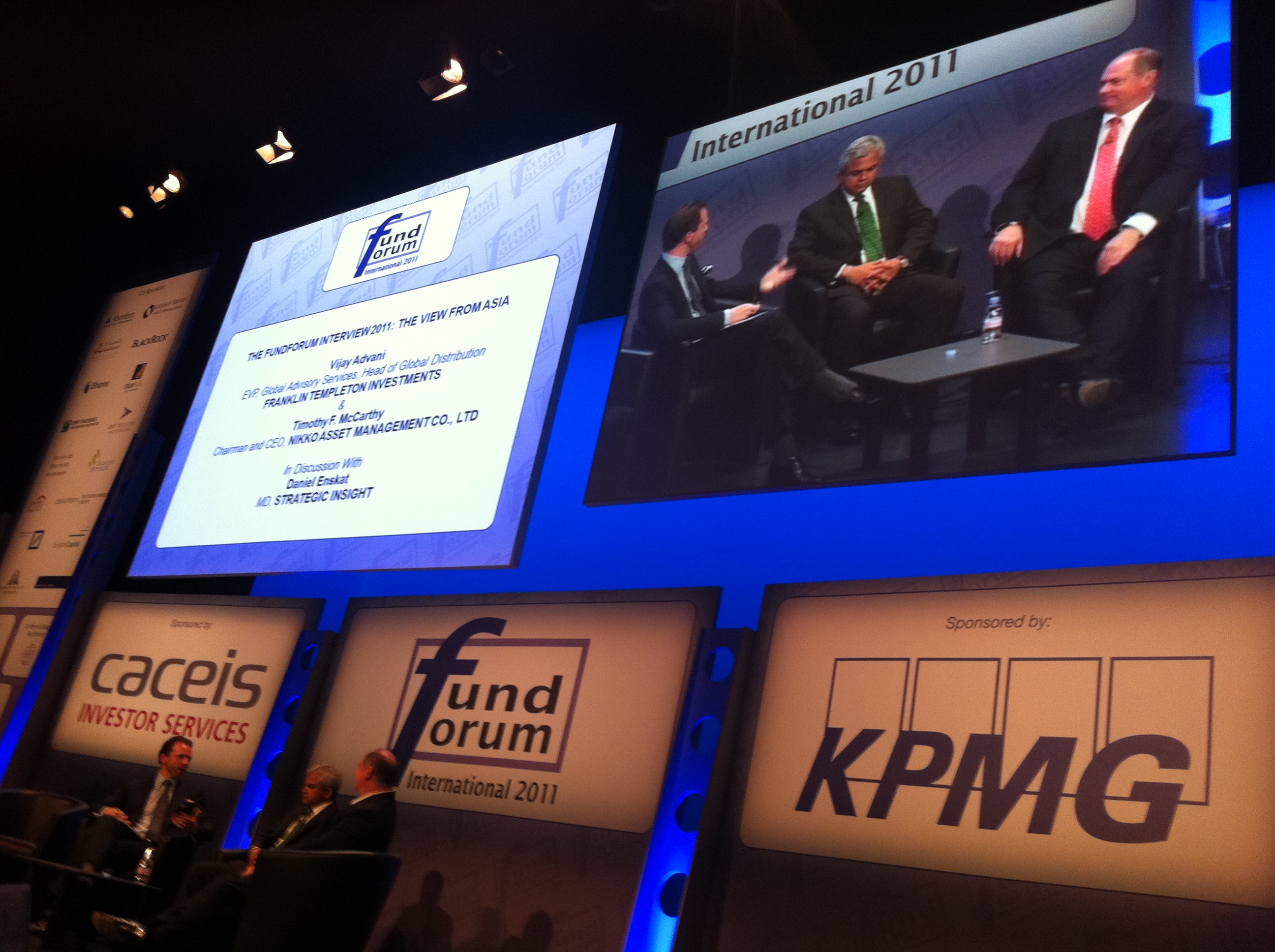 Up next was the “FundForum Interview 2011: The View From Asia”, where I had the pleasure to speak with Vijay Advani (Franklin Templeton) and Tim McCarthy (Nikko). Tim and Vijay are probably the most knowledgable executives on Asia and how the region links to the US, Europe and the rest of the world. Tim was a senior executive with Schwab and Fidelity in the US, and spent many years all over Asia before taking over the role of CEO & Chairman for Nikko Asset Management. Vijay now runs Franklin Templeton globally out of San Mateo, but in reality spent many years building the business for the firm in Asia as well and practically lives on a plane.