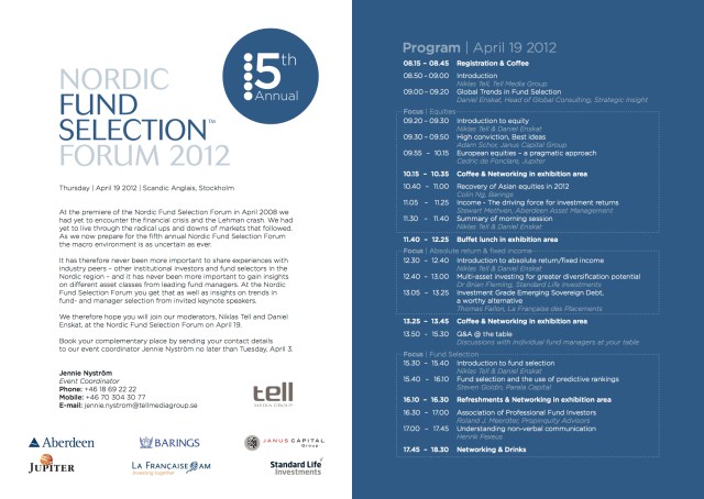 After Wednesday’s speech and panel at Milan’s Bocconi University for the “Salone del Risparmio”, it is off to Stockholm for the 5th Nordic Fund Selection Forum 2012 on April 19th, for the opening speech on global trends in fund selection (drawing from AI/SI proprietary research and advisory work with some 1,200 key asset holders worldwide since 2008).