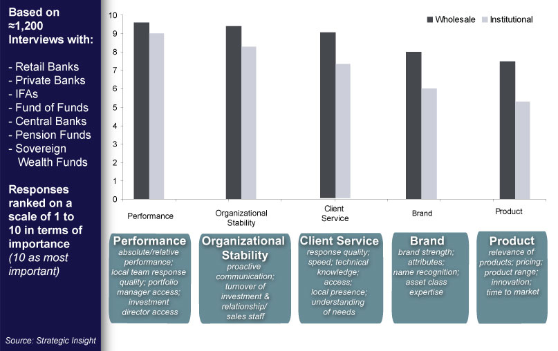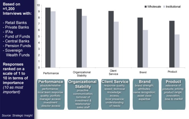 Based on Asset International/Strategic Insight proprietary research and surveys with asset holders in Asia-Pacific and worldwide, brand post-crisis has become a key decision criterion for them to choose managers and investment products. As discussed in my 2011 book on manager and fund selection processes of global asset holders post-crisis, the right mix of investment performance, brand, service and organizational stability has enabled blockbuster firms to collect $1 trillion in net cash flows each year from 2009 through 2011.
