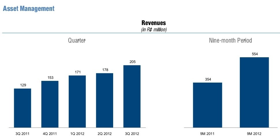 Investment funds have grown from R$22 billion last year to R$26 billion in Q3/2012, an increase of almost 20%. Revenues from wealth management shot up 55%, to R$55 million, following an increase in WuM from R$41 billion to R$44 billion. The increase in WuM is mostly attributable to some R$1 billion in cash contributions and a positive mark-to-market of the assets under custody.
